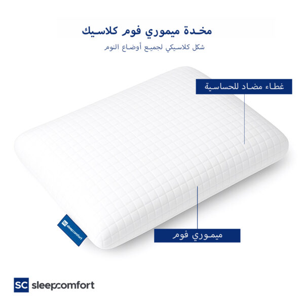 راحة مثالية طوال الليل مع وسادتنا الكلاسيكية المصنوعة من ميموري فوم عالي الجودة. تدعم الرأس والرقبة بشكل مخصص، وتناسب جميع أوضاع النوم. غطاء ناعم قابل للغسل وبتصميم يسمح بالتهوية.
